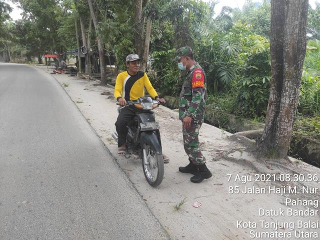 Tanjung Balai | Guna untuk memutus mata rantai penyebaran Virus Covid 19 di wilayah Binaan, dalam hal ini Personel Bintara Pembina Desa (Babinsa) Koramil 17/Datuk Bandar jajaran Kodim 0208/Asahan Serka I.K Siahaan turun kewilayah binaan untuk turut serta melaksanakan kegiatan pengawasan protokol covid-19 kepada masyarakat dengan memberikan pemahaman New Normal yaitu menggunakan masker setiap keluar rumah,cuci tangan pakai sabun, menjaga jarak dan membagikan masker, kegiatan tersebut yang dilaksanakan bertempat di Jalan Haji M. Nur Kelurahan Pahang Kecamatan Datuk Bandar Kota Tanjung Balai, Sabtu (07/08/2021).