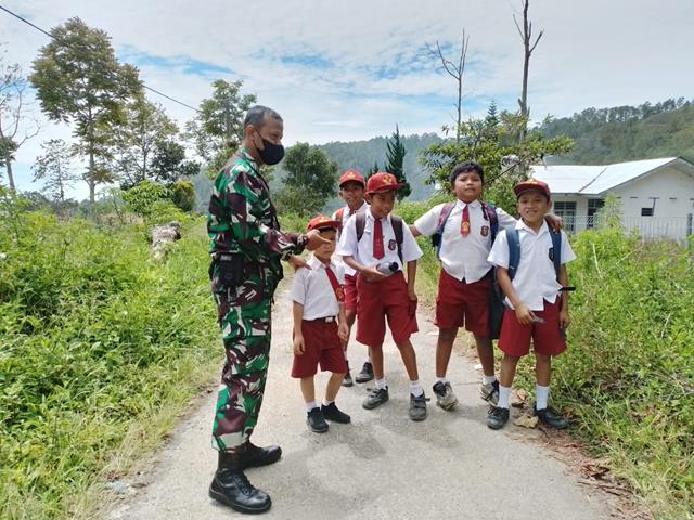 Simalungun | Sejumlah anak sekolah di tempat umum tidak luput dari perhatian Babinsa dan Warga yang tidak mengenakan masker diberi himbauan dan diberikan masker secara gratis oleh para Babinsa, dalam hal ini seperti yang dilakukan oleh Personel Bintara Pembina Desa (Babinsa) Koramil 15/Dolok Pardamean jajaran Kodim 0207/Simalungun Serda Rohimin turun kewilayah binaan untuk melaksanakan kegiatan Komunikasi Sosial (Komsos) bersama dengan Pelajar Siswa SD menghimpabau agar tetap semangat dalam belajar serta tetap memberikan himbauan agar tetap mematuhi protokol kesehatan dengan memakai masker, mencuci tangan menjaga jarak, kegiatan tersebut yang dilaksanakan bertempat di Nagori Parik Sabungan Kecamatan Dolok Pardamean Kabupaten Simalungun, Senin (19/09/2022).